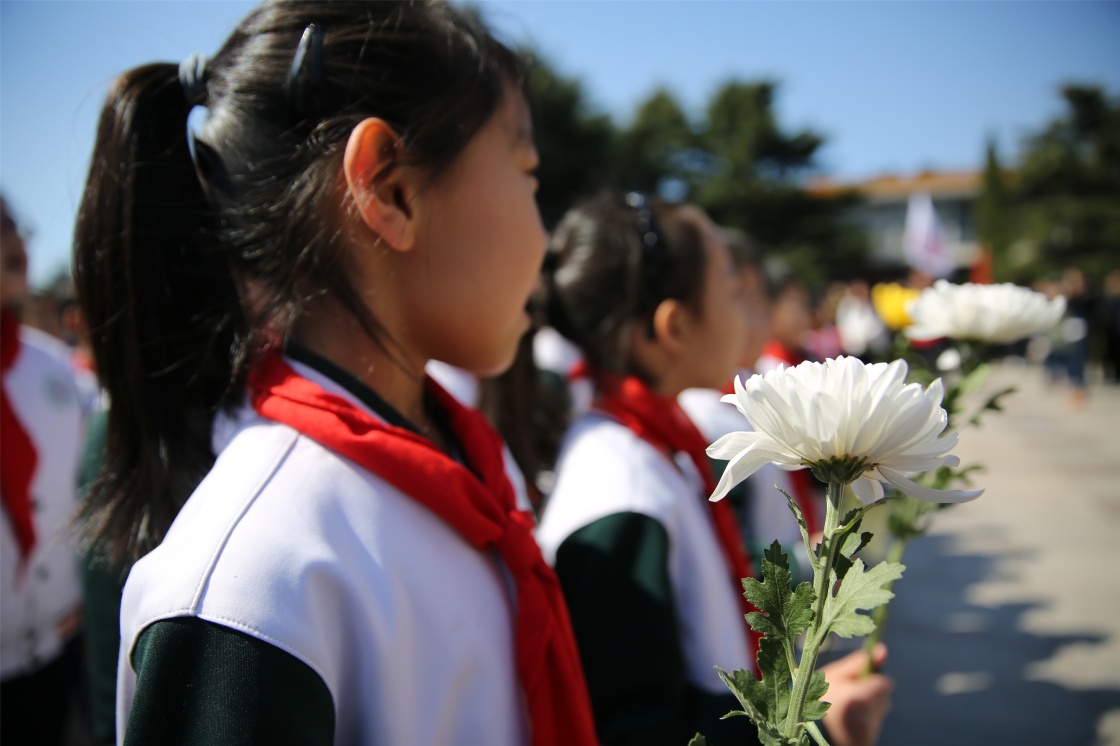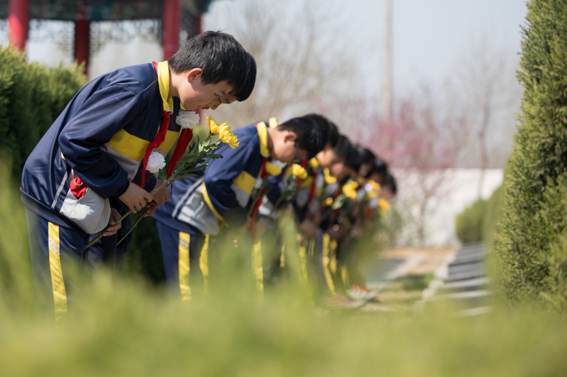 4月3日,山東省淄博市(shì)高(gāo)青縣田鎮中心小學(xué)學(xué)生向革命先烈敬獻鮮花。新華社發 張維堂 攝