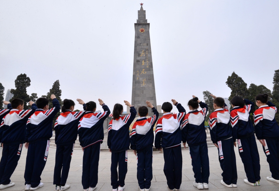4月2日,河北(běi)省邯鄲市(shì)農林路小學(xué)學(xué)生在晉冀魯豫烈士陵園向先烈敬禮。新華社發 郝群英 攝
