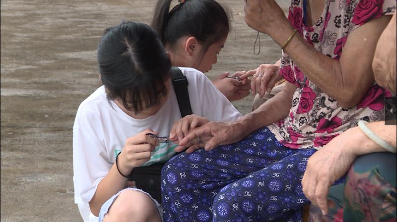 小小義工為(wèi)老人剪指甲。圖片來源:湘鄉融媒