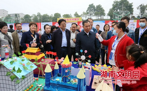 湖南省委宣傳部副部長(cháng)、省文明辦主任肖淩之,省委宣傳部二級巡視(shì)員熊科(kē)文等領導參觀全省鄉村學(xué)校少年(nián)宮特色項目成果展。圖片來源:湖南文明網 記者 彭團 攝