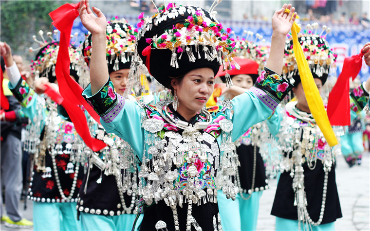 跳花節上,身着節日盛裝的(de)苗家兒女表演節目。鳳凰縣成功打造了一(yī)批民族知名活動品牌,深受群衆喜愛。圖片來源:湖南文明網