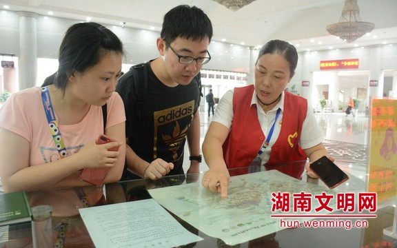袁謀文為(wèi)遊客講解景區遊玩線路。圖片來源:湖南文明網 記者 黃藤 攝