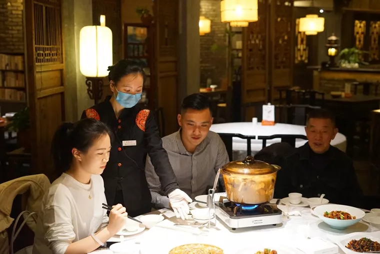 餐廳內(nèi),服務員提醒顧客使用公筷公勺。