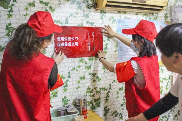 芙蓉區東沙社區志願者深入轄區餐飲門店,張貼文明用餐、文明分餐公益廣告等。