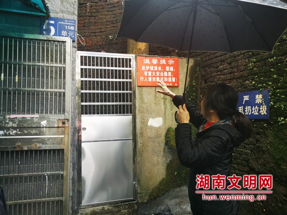 社區居民正在給記者介紹新安裝的(de)防護門。圖片來源:湖南文明網