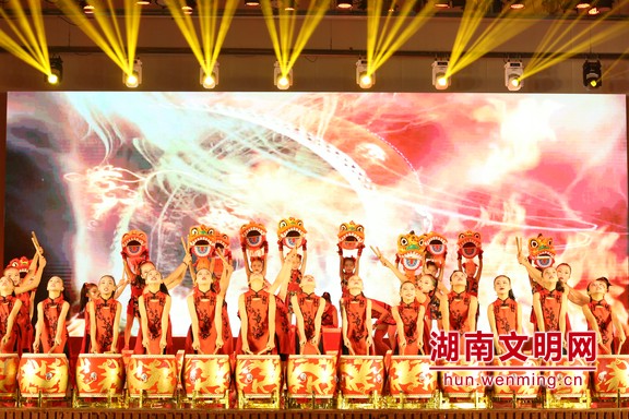 全省鄉村學(xué)校少年(nián)宮特色項目成果展之舞蹈《金鼓咚咚響》。圖片來源:湖南文明網 記者 彭團 攝