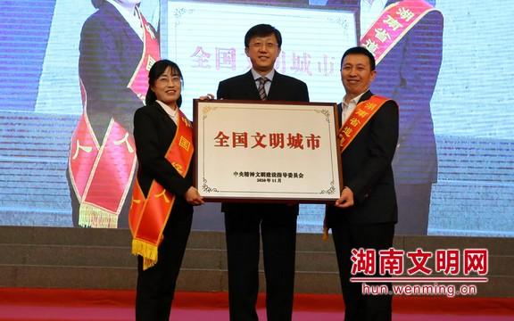 “全國(guó)文明城市(shì)”獎牌接力完成後,領導與代表合影留念。圖片來源:湖南文明網 記者 彭團 攝