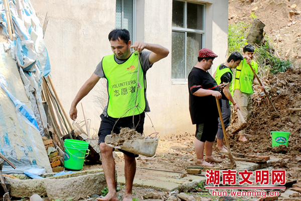 張家界志願者幫助村民清理(lǐ)淤泥。圖片來源:湖南文明網