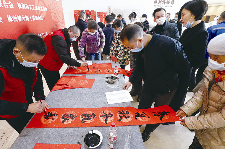 1月28日,文藝志願者在株洲博物館為(wèi)市(shì)民手寫春聯。圖片來源:株洲文明網