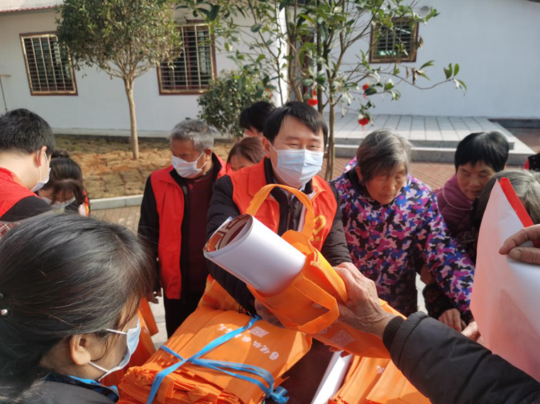 1月28日,攸縣春聯街道(dào)春風社區,志願者為(wèi)社區居民送年(nián)曆。圖片來源:株洲文明網