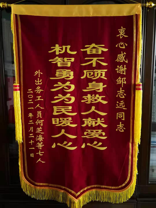 送給鄒志遠同志的(de)錦旗,感謝他奮不顧身救人行(xíng)為(wèi)。