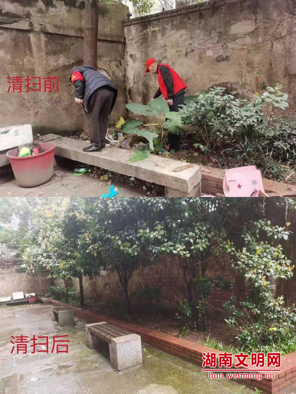 小區花壇清掃前後的(de)對比。圖片來源:湖南文明網