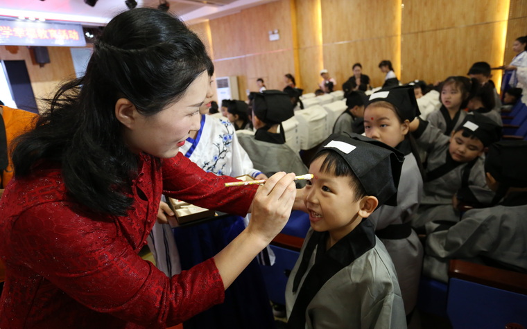 活動分為(wèi)“始禮”“自(zì)正衣冠”“敬拜先賢”“感恩師長(cháng)”“朱砂啓智”“開筆(bǐ)啓蒙”“擊鼓明志”七項儀式環節,還增設了分會場,增加了家長(cháng)和(hé)孩子(zǐ)們的(de)互動。“冠必正,紐必結,襪與履,俱緊切”,在“自(zì)正衣冠”環節,孩子(zǐ)們在《弟子(zǐ)規》的(de)朗誦聲中,跟着示範者扶正衣冠,系好鞋帶,“扣好人生第一(yī)粒扣子(zǐ)”;“看!我額頭上有(yǒu)一(yī)個紅(hóng)粒粒!”“我也有(yǒu)!”在“朱砂啓智”環節中,嘉賓、老師、家長(cháng)們用朱砂在孩子(zǐ)額頭正中點上紅(hóng)痣,意為(wèi)開啓智慧;“一(yī)撇一(yī)捺寫成人,一(yī)生一(yī)世學(xué)做(zuò)人,工工整整寫人字,堂堂正正中國(guó)人!”在“開筆(bǐ)啓蒙”環節,八一(yī)路小學(xué)黨支部書記戴洪林帶領孩子(zǐ)們寫“人”字并诠釋“人”字的(de)意義;“我長(cháng)大想當一(yī)名科(kē)學(xué)家”“我想當一(yī)名班主任”,在“擊鼓明志”環節中,孩子(zǐ)們說出心願,家長(cháng)則勉勵他們,“要實現理(lǐ)想,就要從現在開始,養成良好的(de)學(xué)習習慣”……